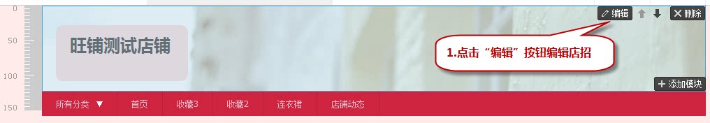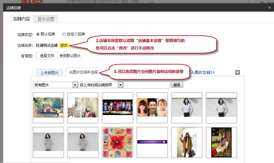 1.如何编辑店招?首先进入店铺后台 点击店招“编辑”按钮 2.可以使用默认的店铺招牌 “店铺名称”虽然是默认店铺基本设置 也可以修改 3.可以选择图片空间选择图片进行默认店招背景
