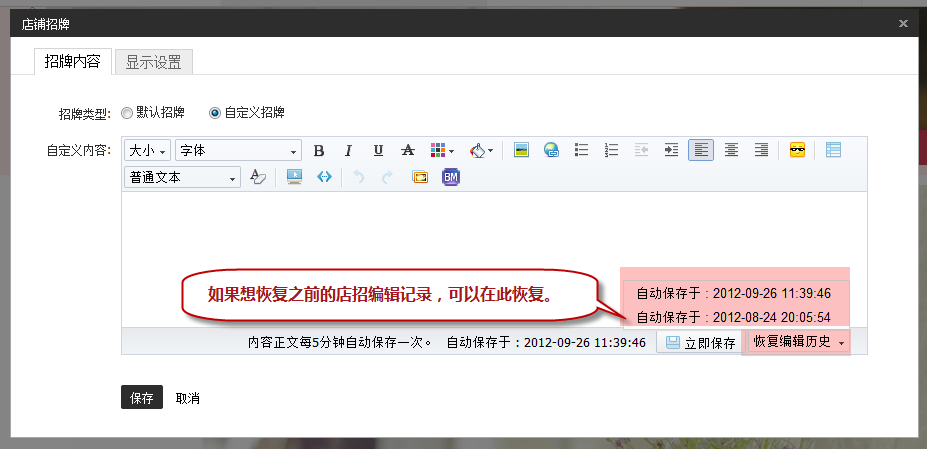 5.自定义招牌可以自由的输入代码 如果店招自定义区内什么都没有 是空白 店招就会“消失不见” 6.可以在右下方恢复历史记录 7.最后进行保存即可拉!
